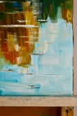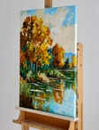 I wanted to capture the beauty of fall at its peak. The bright yellow trees and the calm water create a feeling of peace and quiet. This painting is a simple celebration of nature and the warm energy of a sunny afternoon.